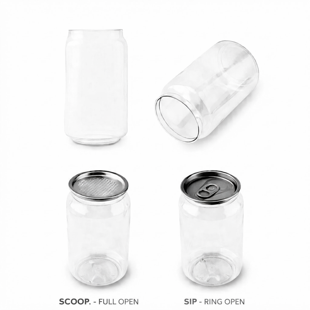 SCOOP: Deckel A Full Open – Dessert öffnen & löffeln. SIP: Deckel B Ring-Öffnung – Drinks ausgeben & trinken.