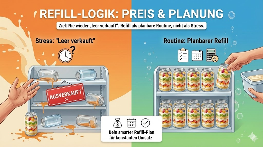 Refill läuft als Set-Bundle: 1 PET-Dose + 1 Deckel = 1 Stück · Deckelwahl ohne Aufpreis · Auswahl im Sortiment.